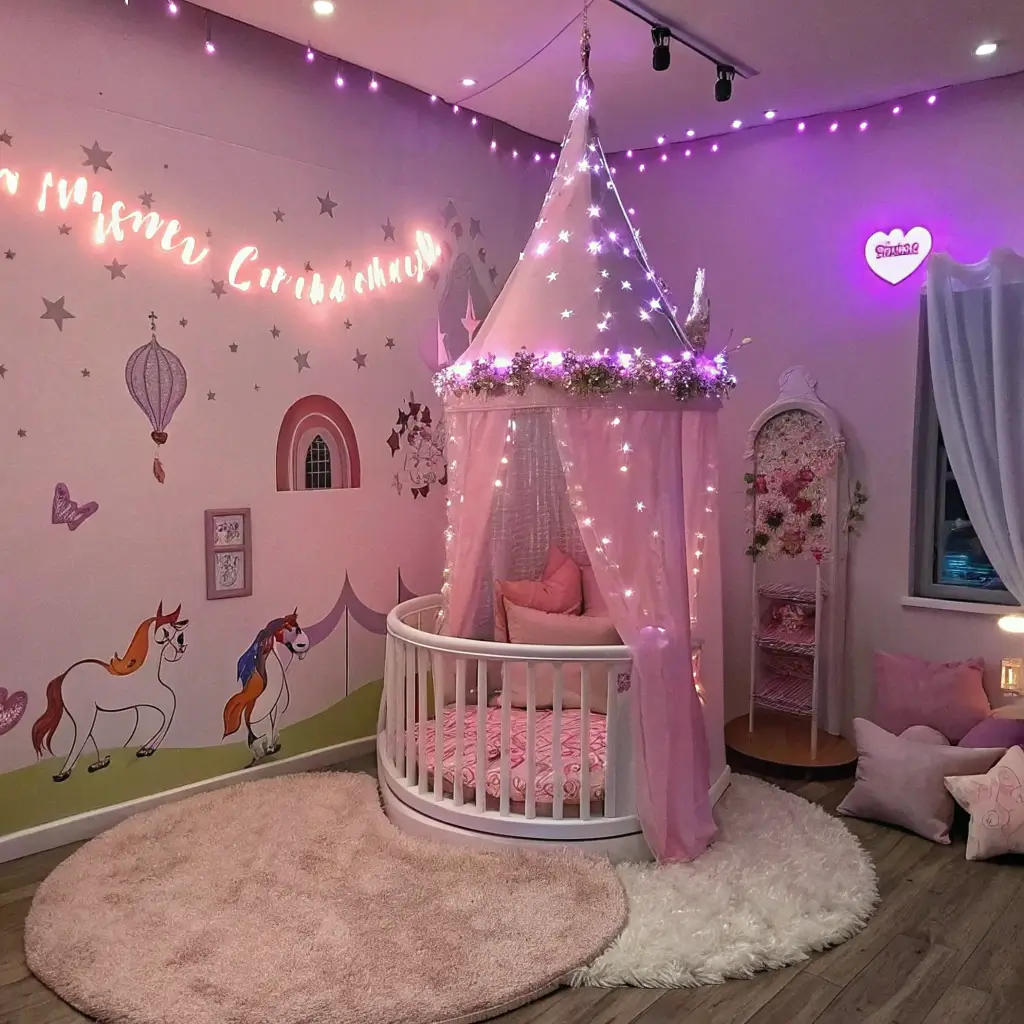 My niece’s fairy tale nursery still gives me goosebumps—in the best way. Her mom painted a castle mural behind the crib and added twinkling lights to create a starry sky effect on the ceiling.