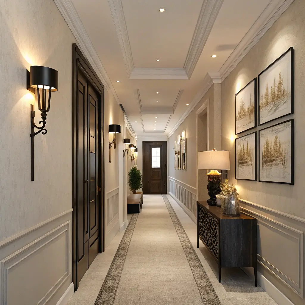 Fairy lights or LED strips tucked behind crown molding create a magical glow. Sure, it might sound a bit college-dorm-ish, but executed properly, it looks absolutely stunning. The indirect lighting bounces off the ceiling, making your hallway appear taller and more spacious.