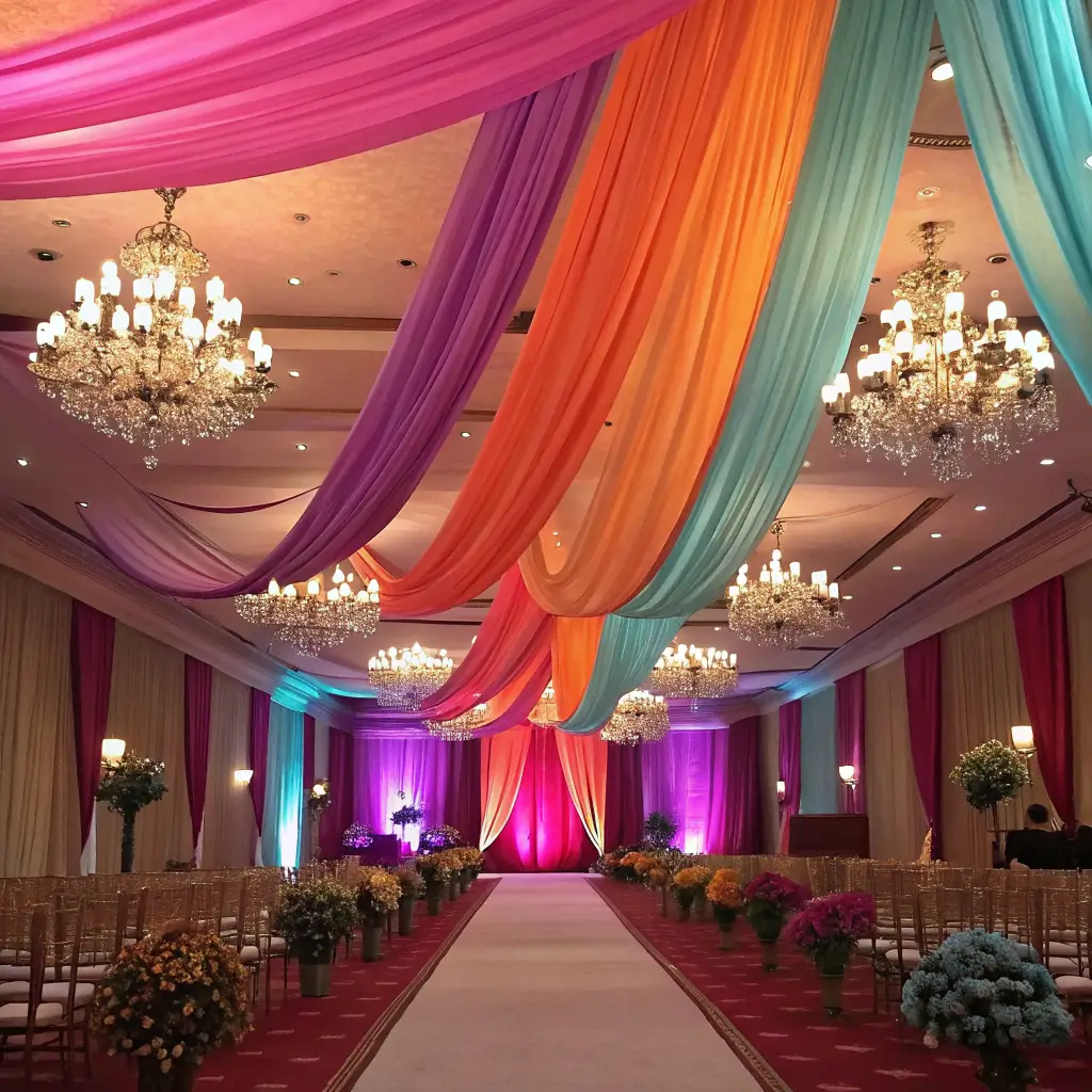 Fabric draping in multiple colors creates this dreamy, tent-like atmosphere that makes even the most basic venues feel magical. I’m talking about flowing chiffon or tulle in sunset colors – think coral, peach, golden yellow, and soft pink all flowing together like a painted sky.