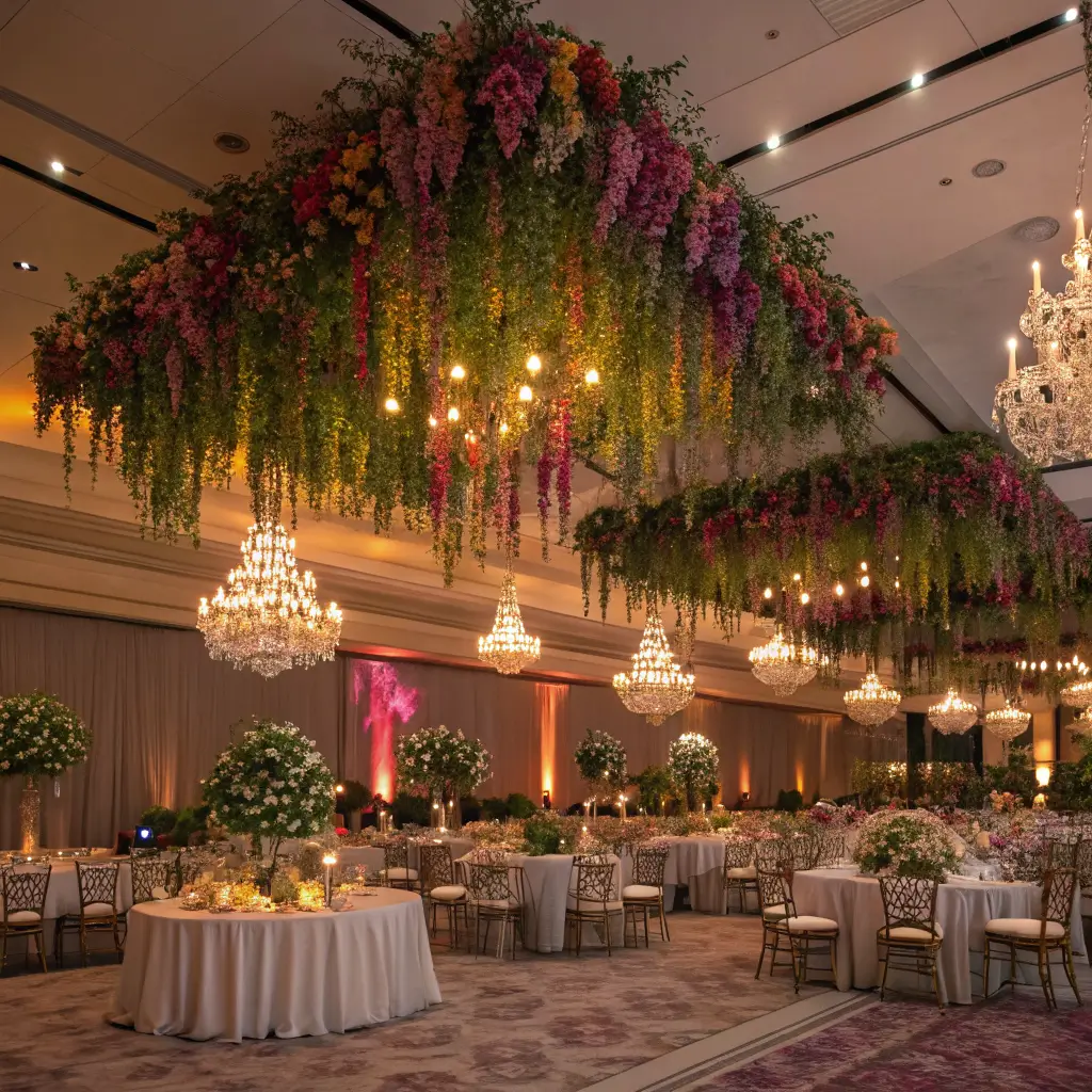 The scale of these installations can vary dramatically depending on your venue and budget. Small floral chandeliers work beautifully over individual tables, while larger installations can serve as dramatic focal points over dance floors or ceremony spaces.