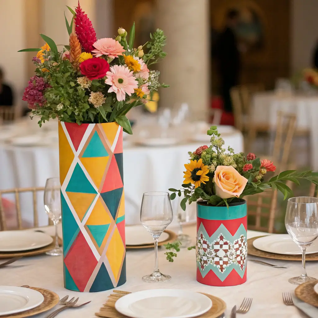 The beauty of geometric centerpieces is their versatility. You can create different shapes and sizes for each table while maintaining a cohesive look through your color palette. Metallic accents – gold, silver, or copper – add sophistication to the bold colors.