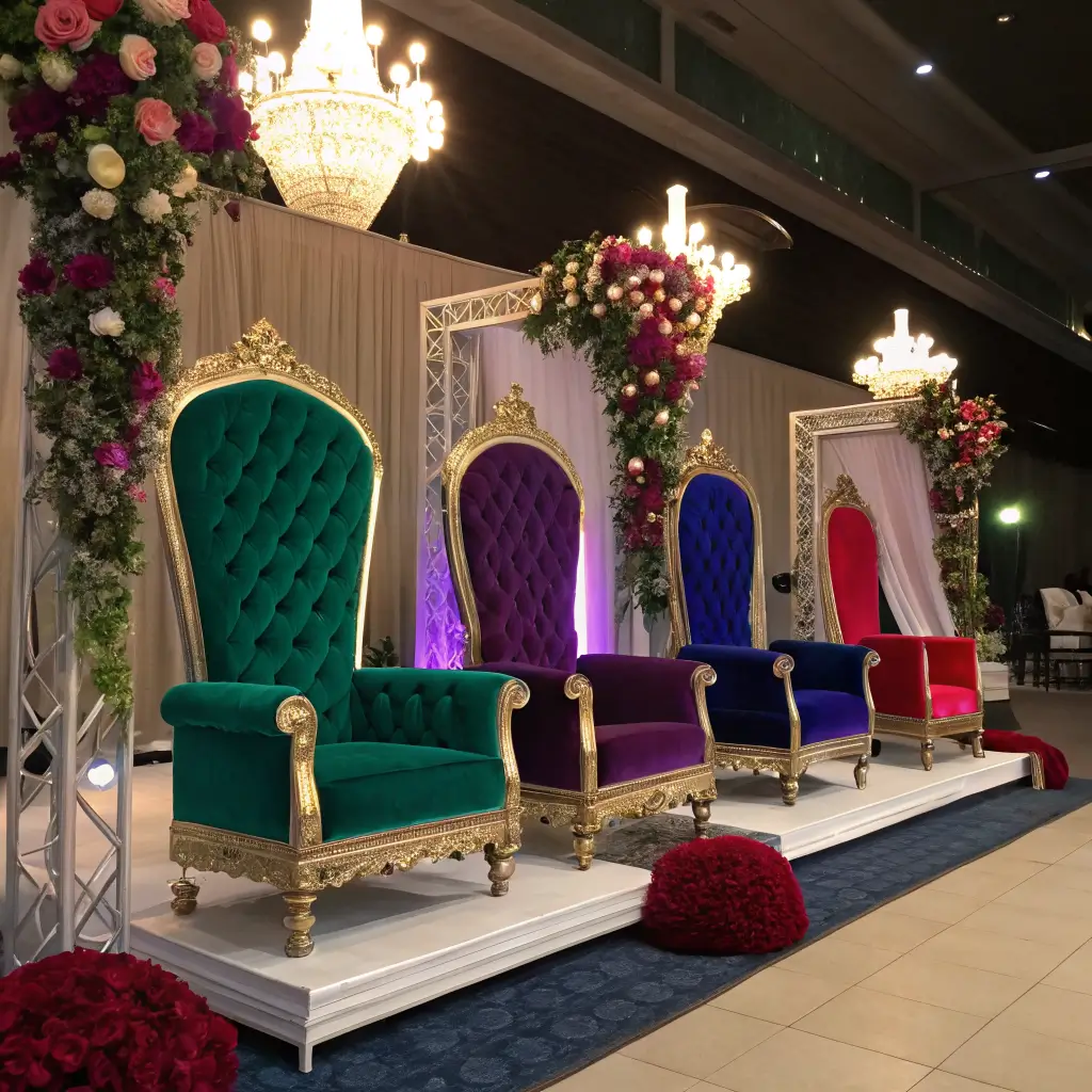 Jewel-toned seating arrangements are like giving your guests front-row seats to a rainbow. Instead of the standard white or neutral chairs that blend into the background, we’re talking about seating that becomes part of the decor itself.