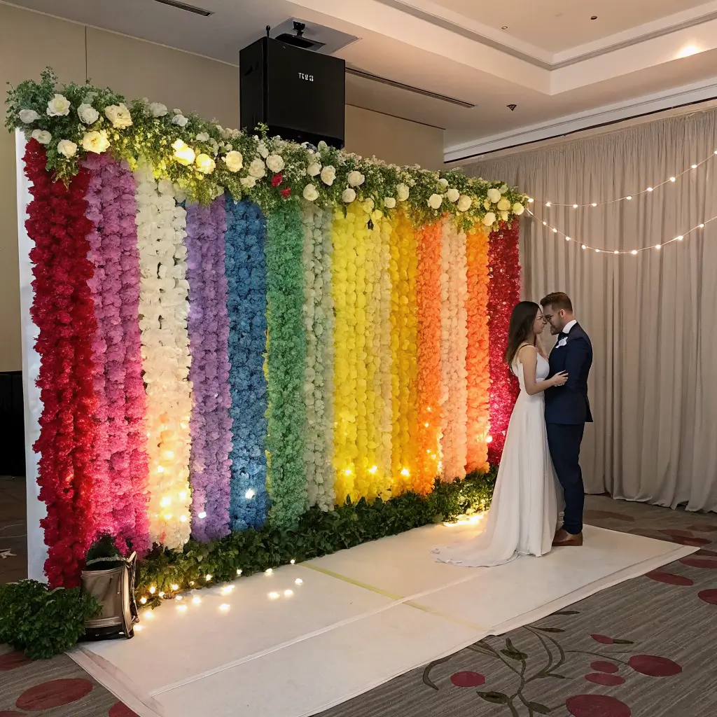 Last but definitely not least, let’s talk about vibrant flower wall photo booths that’ll have your guests lining up for pictures all night long. This isn’t just decor – it’s entertainment, art installation, and memory-maker all rolled into one Instagram-worthy backdrop.