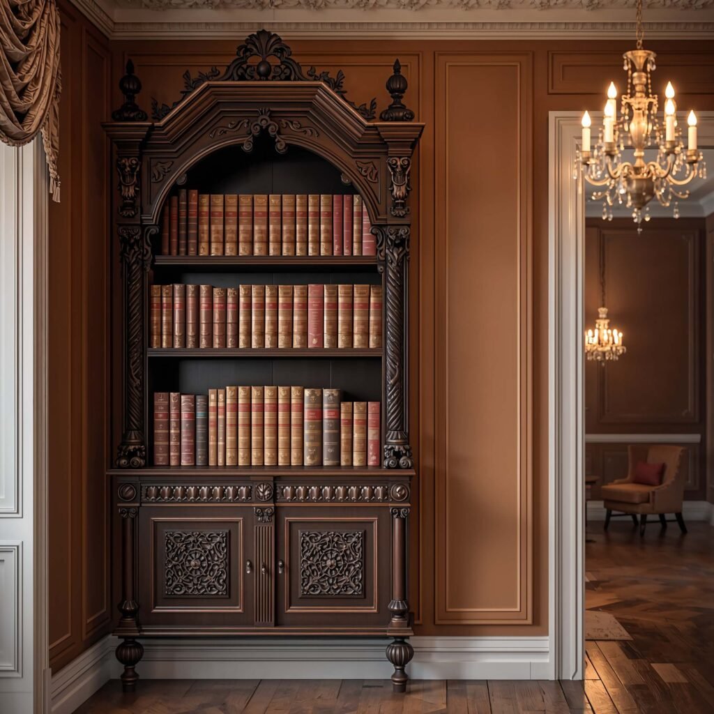 Victorian bookshelves are not for the minimalists among us. These pieces scream “more is more” with their carved details, ornate brackets, and rich, dark finishes. If you’ve ever wanted your home to feel like a scene from Downton Abbey, this is your ticket.