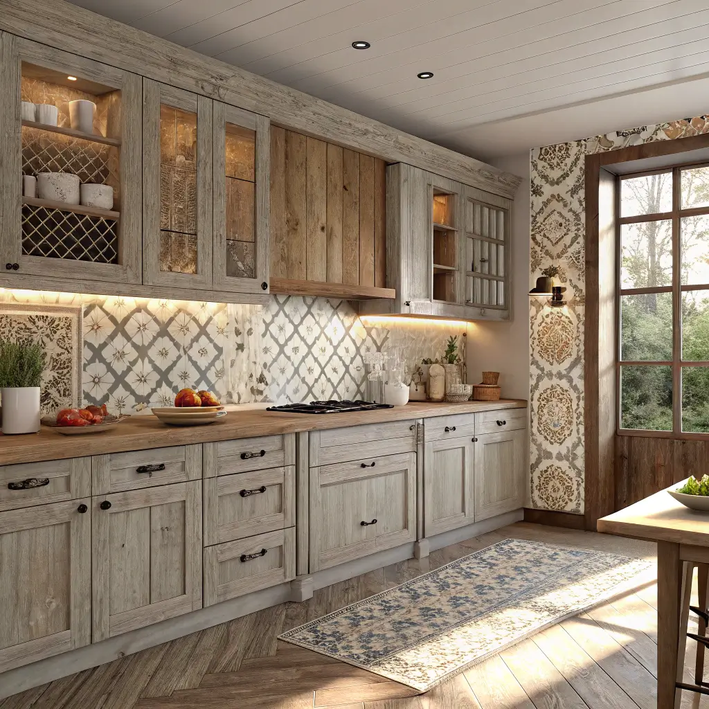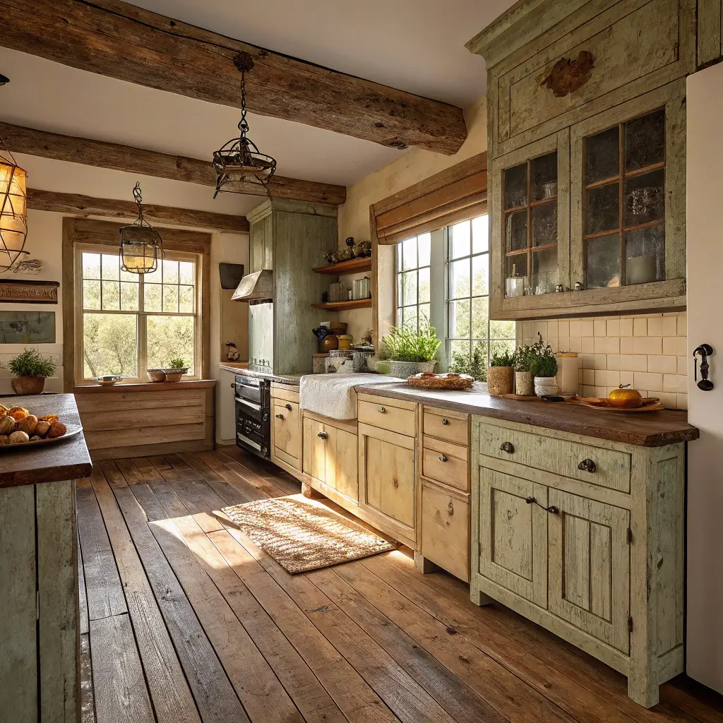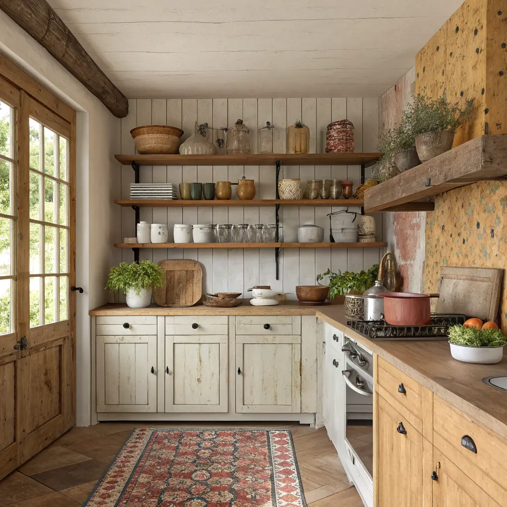 Add vintage-style rugs for warmth and color. Persian runners, braided oval rugs, or simple jute mats all work. They also hide imperfections and add comfort where you stand most.