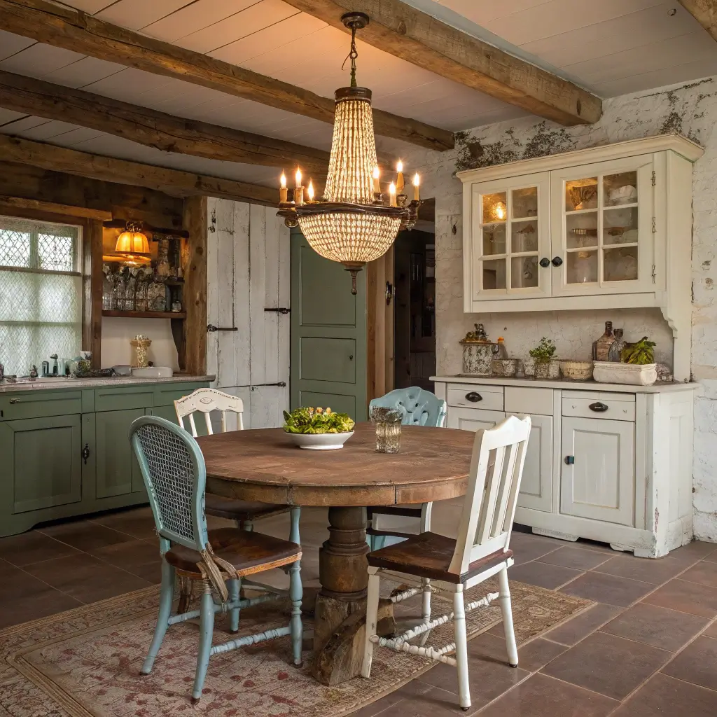 Start with a weathered farm table – rectangular works best for corners. Mismatched chairs add authentic charm (and save money when you’re thrift shopping). I scored four different Windsor chairs over six months, and they look like they’ve always belonged together.