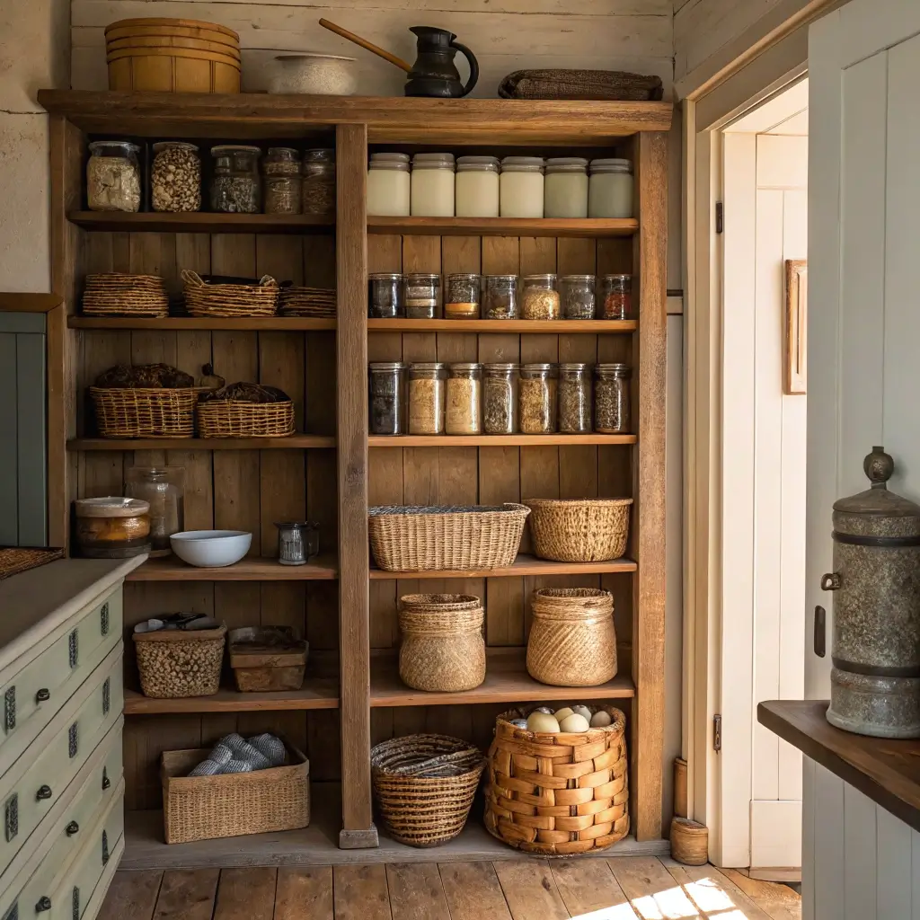 Your pantry should look like something from a vintage general store, not a modern grocery aisle. Glass jars, woven baskets, and wooden crates create that authentic farmhouse pantry aesthetic while keeping everything organized.