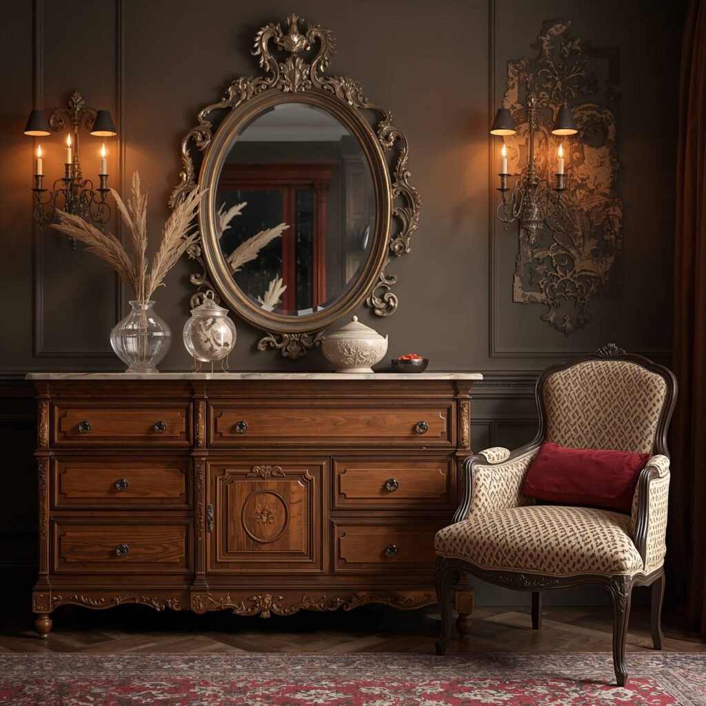 Here’s what actually works: treat your antique pieces as the stars they are. Give them breathing room, proper lighting, and complementary (not matching) companions. That gorgeous Art Deco sideboard? Style it with modern barware and contemporary plants. Your inherited oak desk? Pair it with a modern ergonomic chair and minimalist desk accessories. The juxtaposition keeps things fresh and functional.