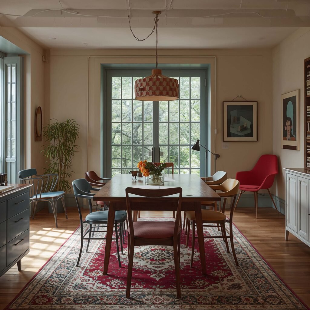The secret to eclectic vintage dining rooms? Mismatched chairs. Seriously, stop trying to find eight matching vintage chairs – it’s impossible and unnecessary. Mix different styles from the same era, or go completely wild and mix decades. I have two mid-century modern chairs, two Victorian parlor chairs, and two 1970s lucite chairs around my table. The key is finding a common thread – similar heights, coordinating colors, or unified upholstery.