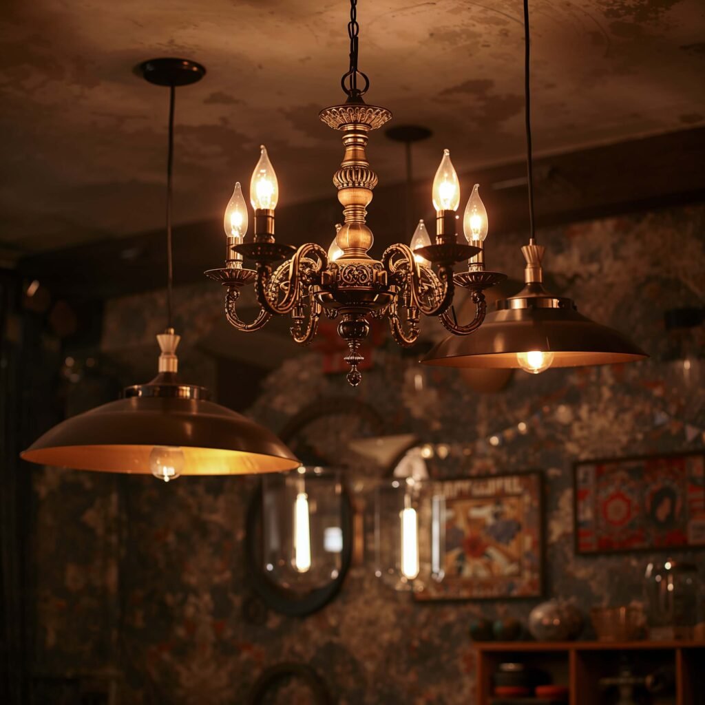 Sputnik chandeliers scream mid-century cool. Crystal chandeliers add instant elegance (and they’re surprisingly affordable at estate sales). Industrial pendant lights bring that vintage factory vibe. But here’s my favorite trick: mixing different vintage lighting styles in the same space. I have a crystal chandelier in my dining room, industrial sconces in the hallway, and a mid-century arc lamp in the living room. Somehow, it all works.
