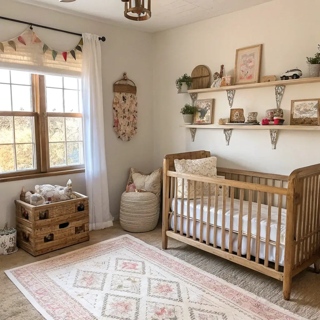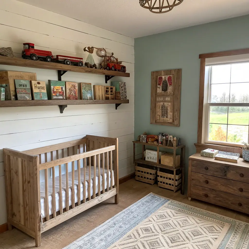 The farmhouse vintage look combines rustic charm with practical design. It’s cozy, welcoming, and forgiving of the chaos that comes with babies. Plus, distressed furniture hides dings better than pristine pieces ever could.