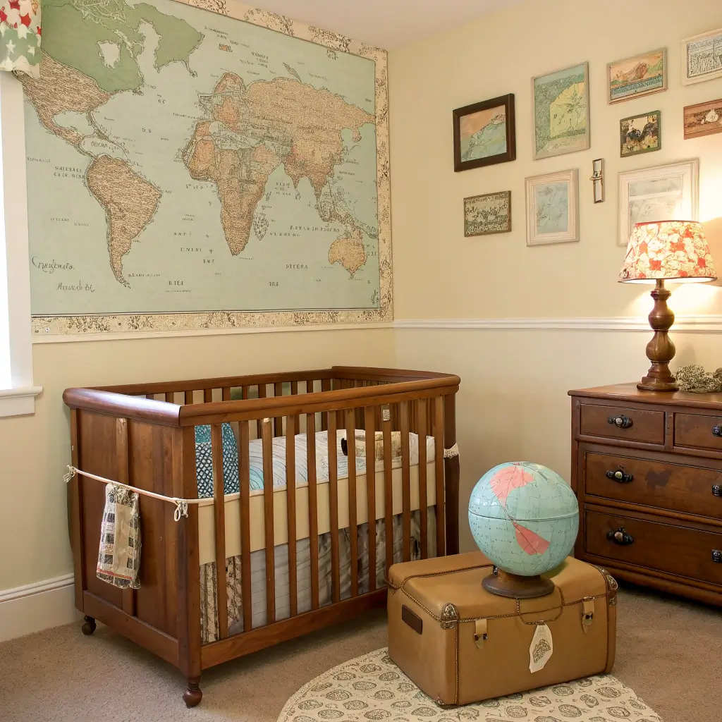 Who says vintage has to mean Victorian? A vintage travel theme brings adventure and nostalgia together. Old maps, vintage suitcases, and retro travel posters create a worldly atmosphere that grows with your child.