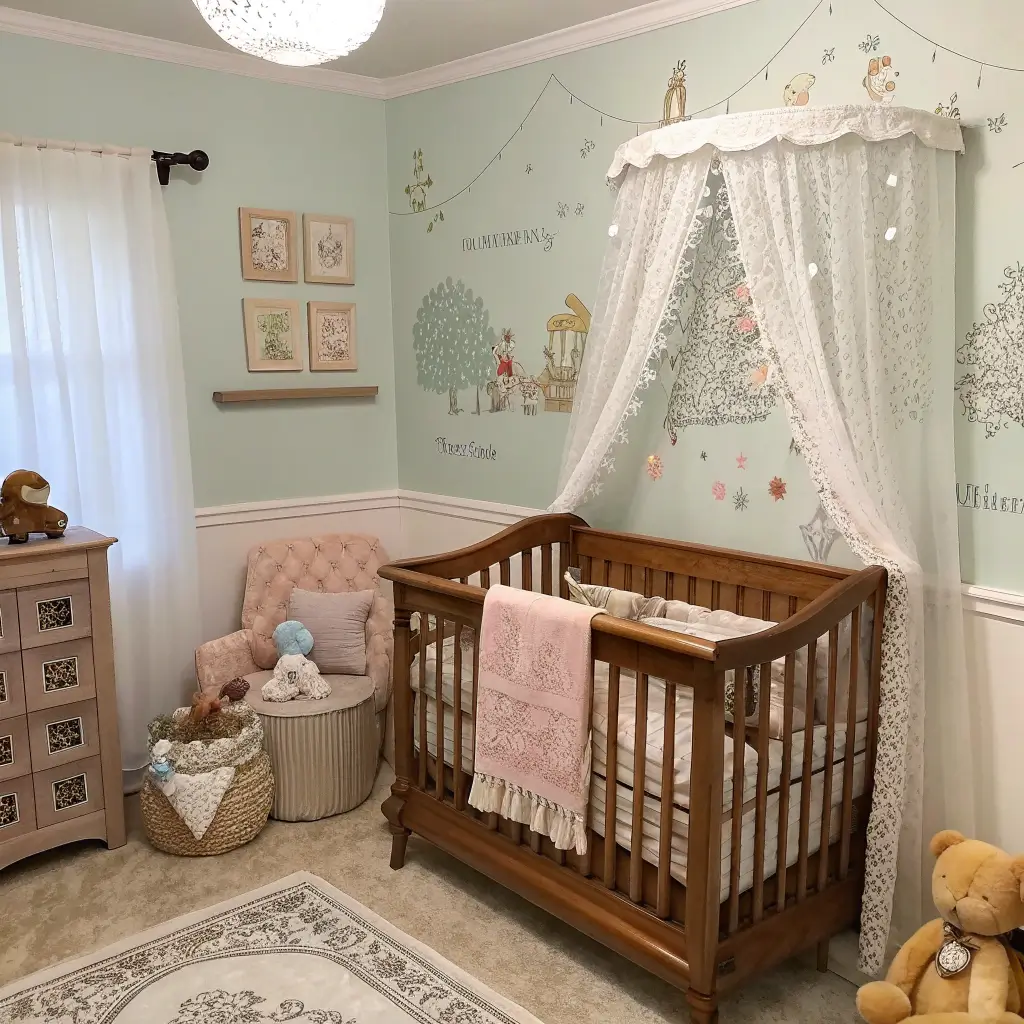 Victorian doesn’t have to mean dark and stuffy. A pastel Victorian nursery combines ornate details with soft colors for a look that’s romantic without being overwhelming. Think dusty rose, sage green, and butter yellow instead of burgundy and forest green.