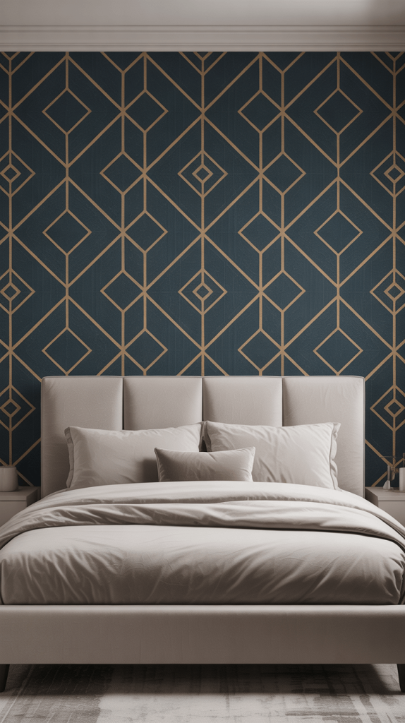 An accent wall with a bold wallpaper is the ultimate way to make a statement and define the bedroom’s focal point, usually behind the bed.