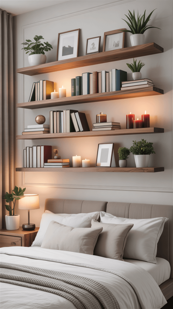 Floating shelves are the workhorses of the decor world. They provide display space without the visual bulk of a traditional bookcase, making them perfect for smaller bedrooms.