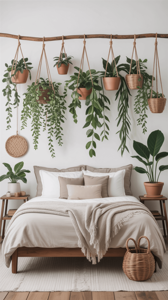 Hanging plants from the ceiling or wall hooks creates dynamic levels and draws the eye upward.