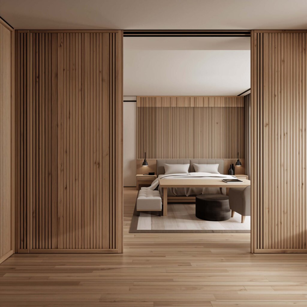 Let’s kick things off with my personal favorite – modern wooden slat partitions. These beauties hit that sweet spot between functional and drop-dead gorgeous. Picture vertical wooden slats with perfectly spaced gaps that let light filter through while still giving you that sense of separation you’re craving.