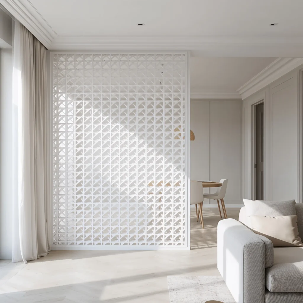 Sometimes less really is more, and white lattice partitions prove this beautifully. These clean, geometric designs add structure without visual weight, making them perfect for smaller spaces that need definition without feeling cramped.
