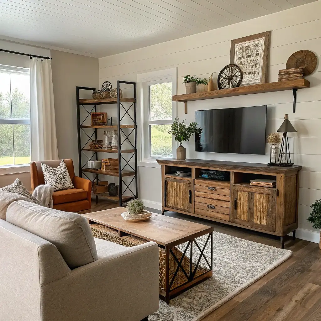 Start with vintage farmhouse staples: an antique hutch, vintage signs, maybe some old farm tools as wall decor. Then punch it up with modern elements like a sleek TV mounted on the wall or contemporary art pieces. The contrast creates visual interest that keeps your eye moving around the room.