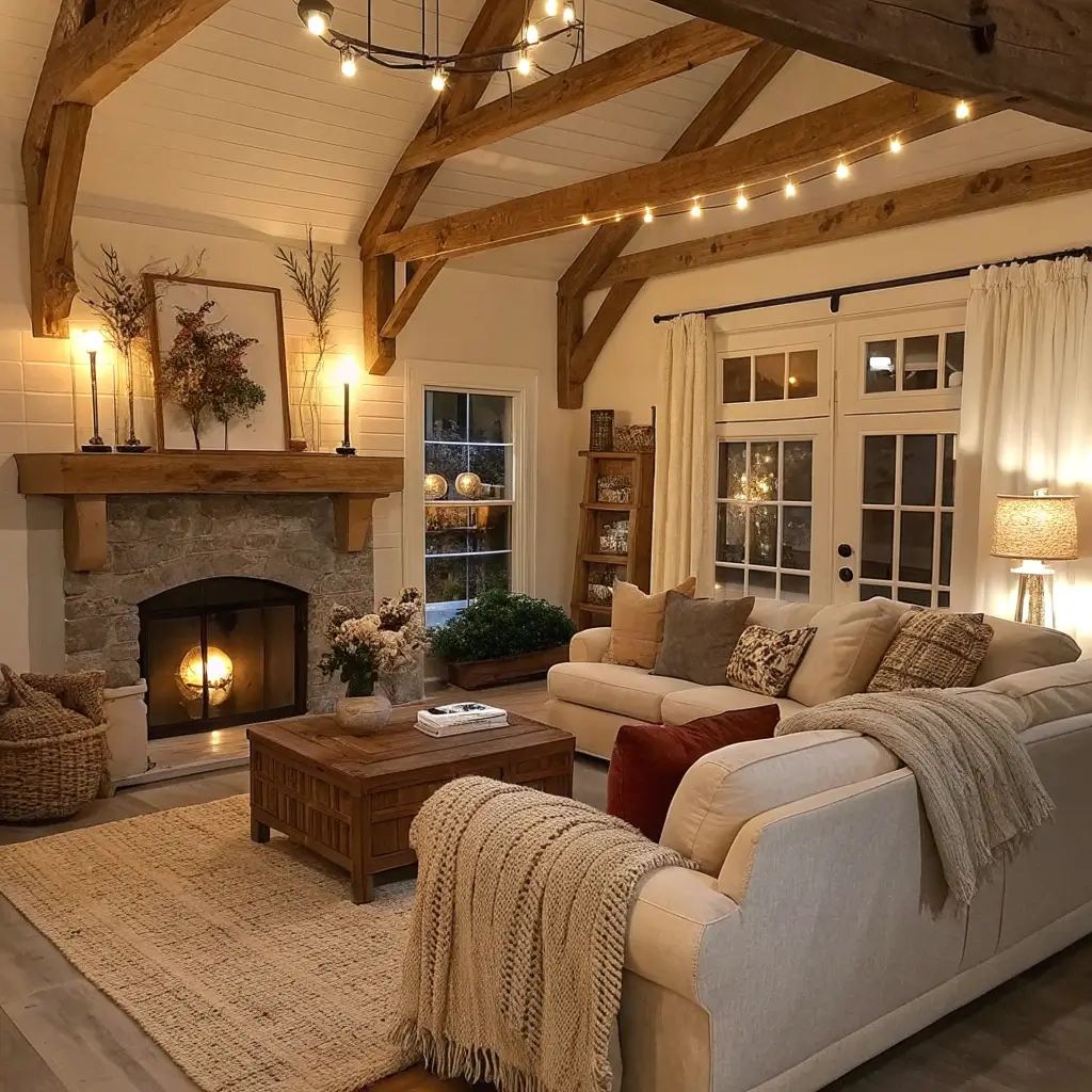 Lighting can literally make your living room feel like a cozy cabin or a cold warehouse—guess which one we’re going for? Warm, layered lighting combined with those gorgeous wooden beams creates an atmosphere that’s basically autumn in a room, year-round.