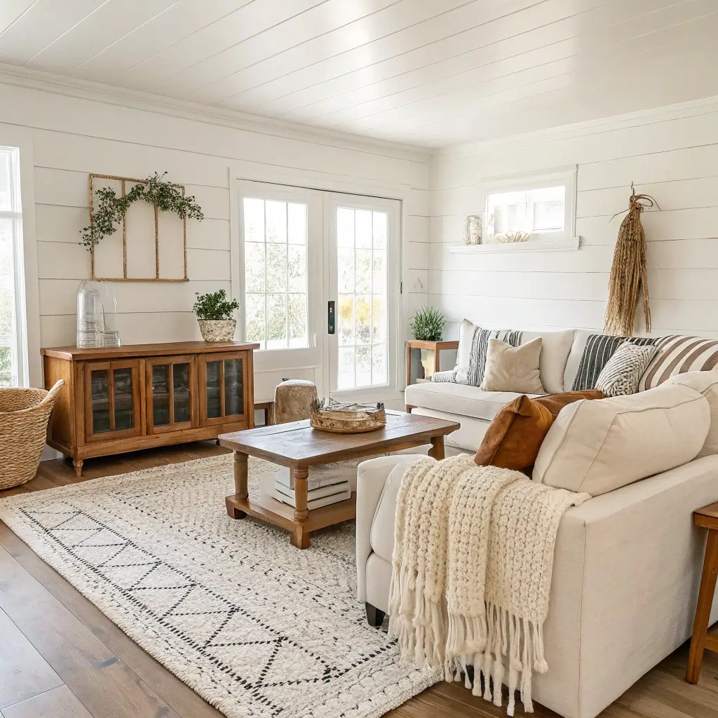 Start with a base of whites, creams, and soft grays. Then bring in those warm wood tones through your furniture, flooring, or accent pieces. I personally love mixing different wood finishes—who says your coffee table has to match your TV stand? Not me!