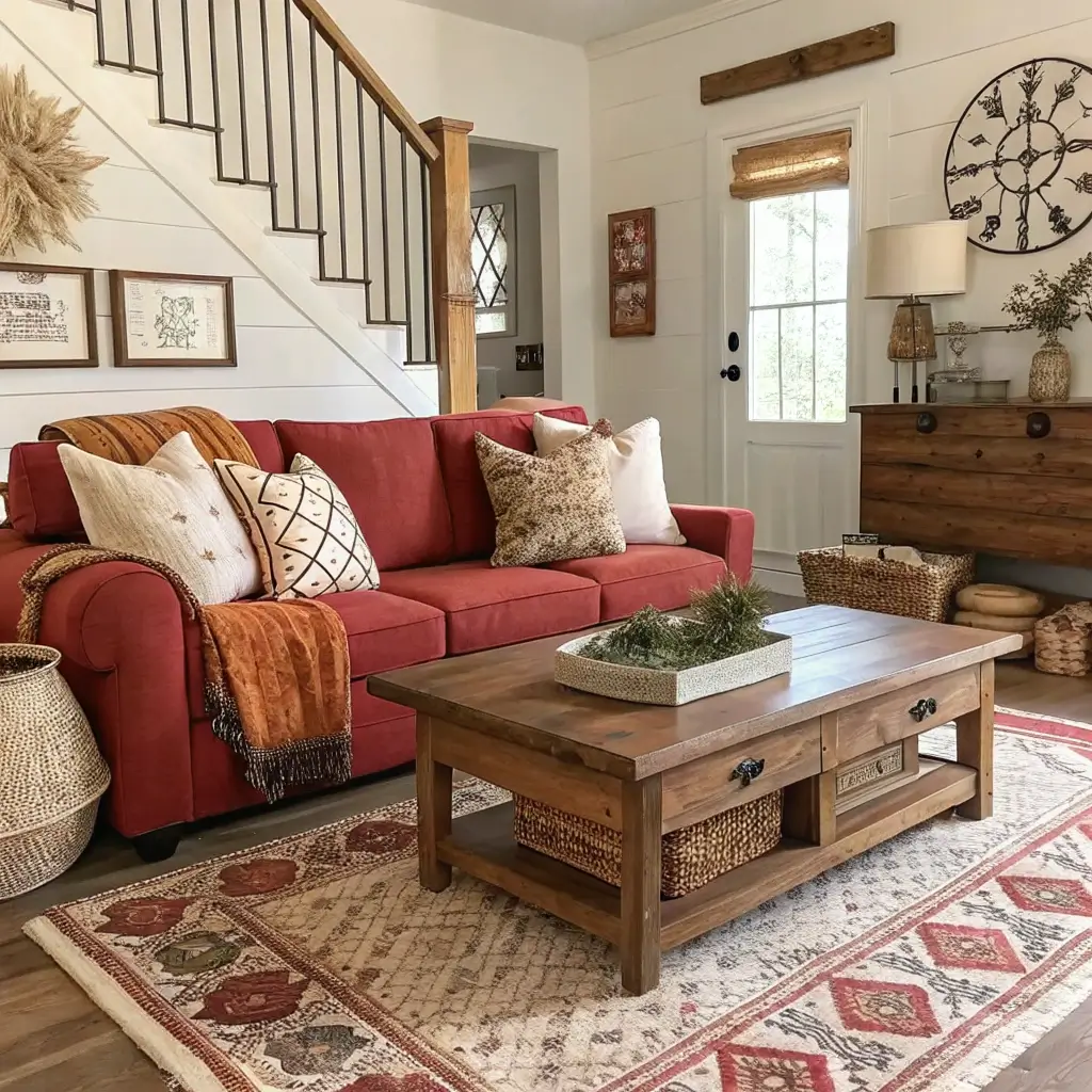 I always tell people to start with a reclaimed wood coffee table—it’s like the cornerstone of rustic farmhouse design. Add some vintage leather armchairs that look like they’ve got stories to tell. Don’t forget those chunky knit throws draped casually over the sofa (because who doesn’t love a good blanket fort opportunity?).