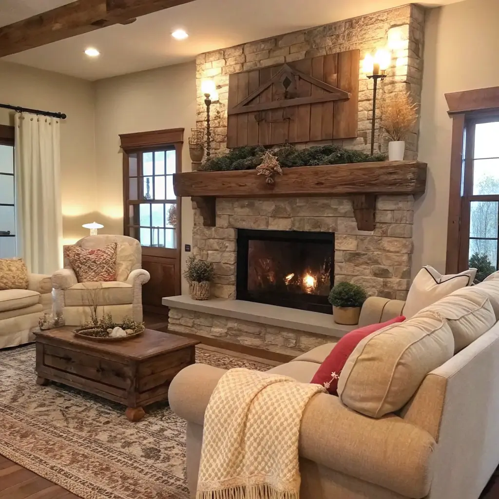 Arrange your furniture to face the fireplace—this creates natural conversation areas and makes the room feel intentional. Add a chunky wooden mantel if you don’t have one; it’s the perfect spot for seasonal decor and family photos.