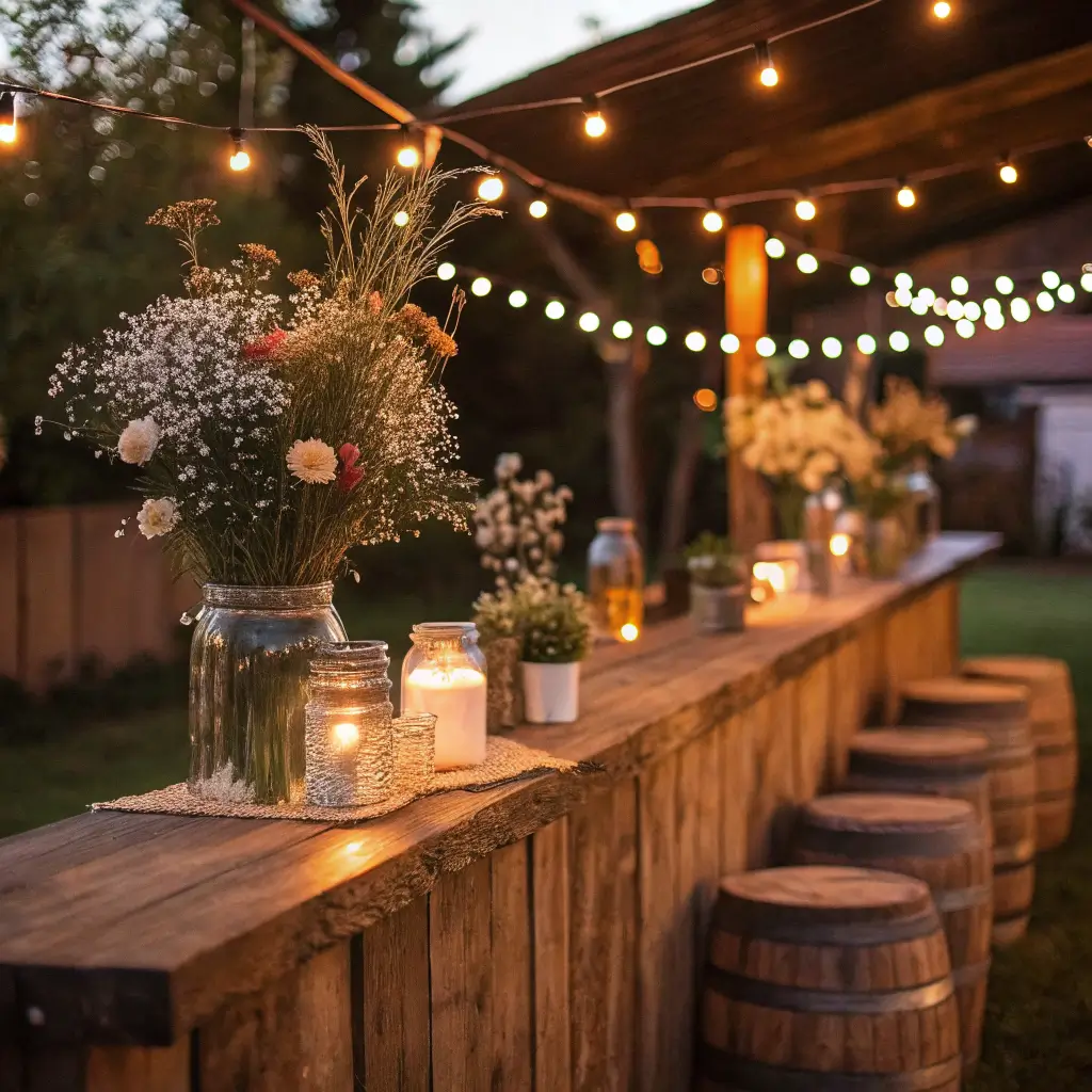 I absolutely love how versatile this look is. You can use reclaimed wood planks, vintage crates, or even repurpose old doors to create your bar structure. The fairy lights add that dreamy, ethereal glow that photographs beautifully during golden hour and creates the perfect ambiance as the sun sets.