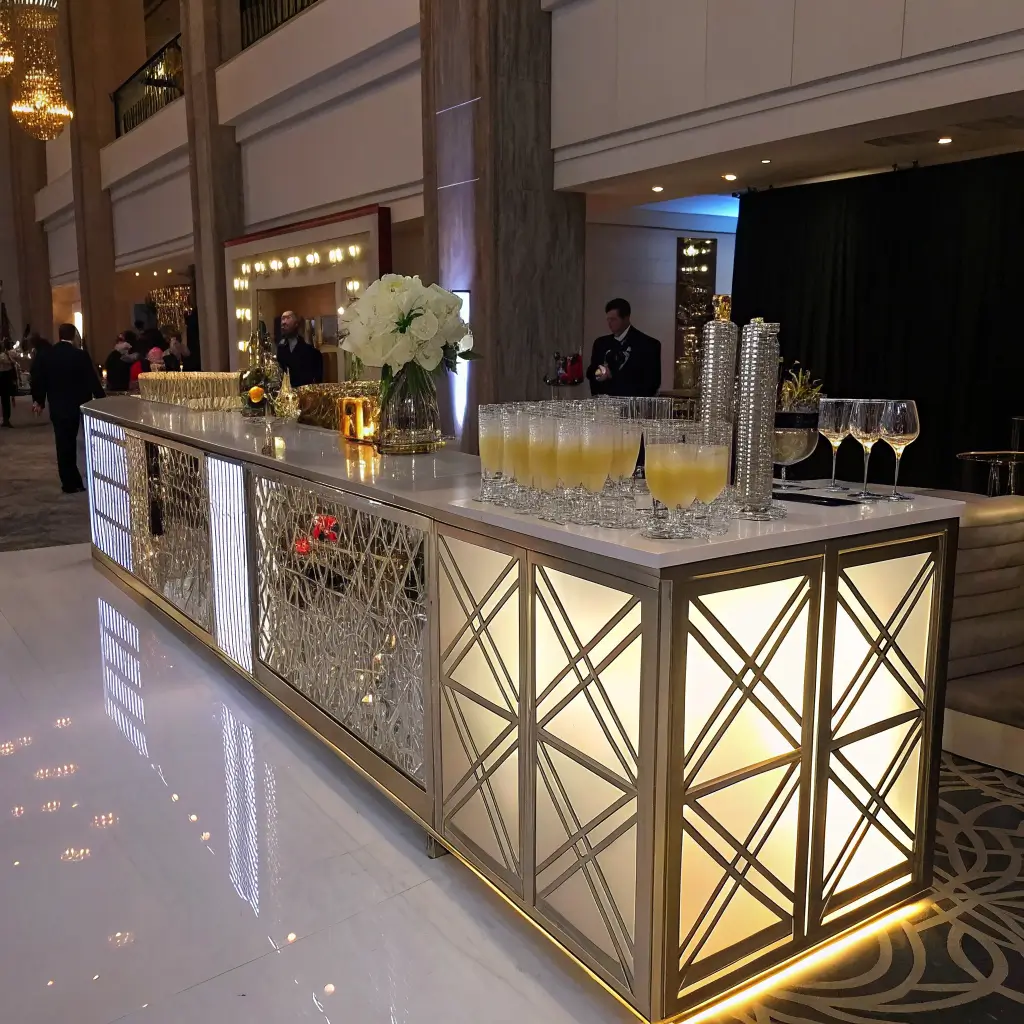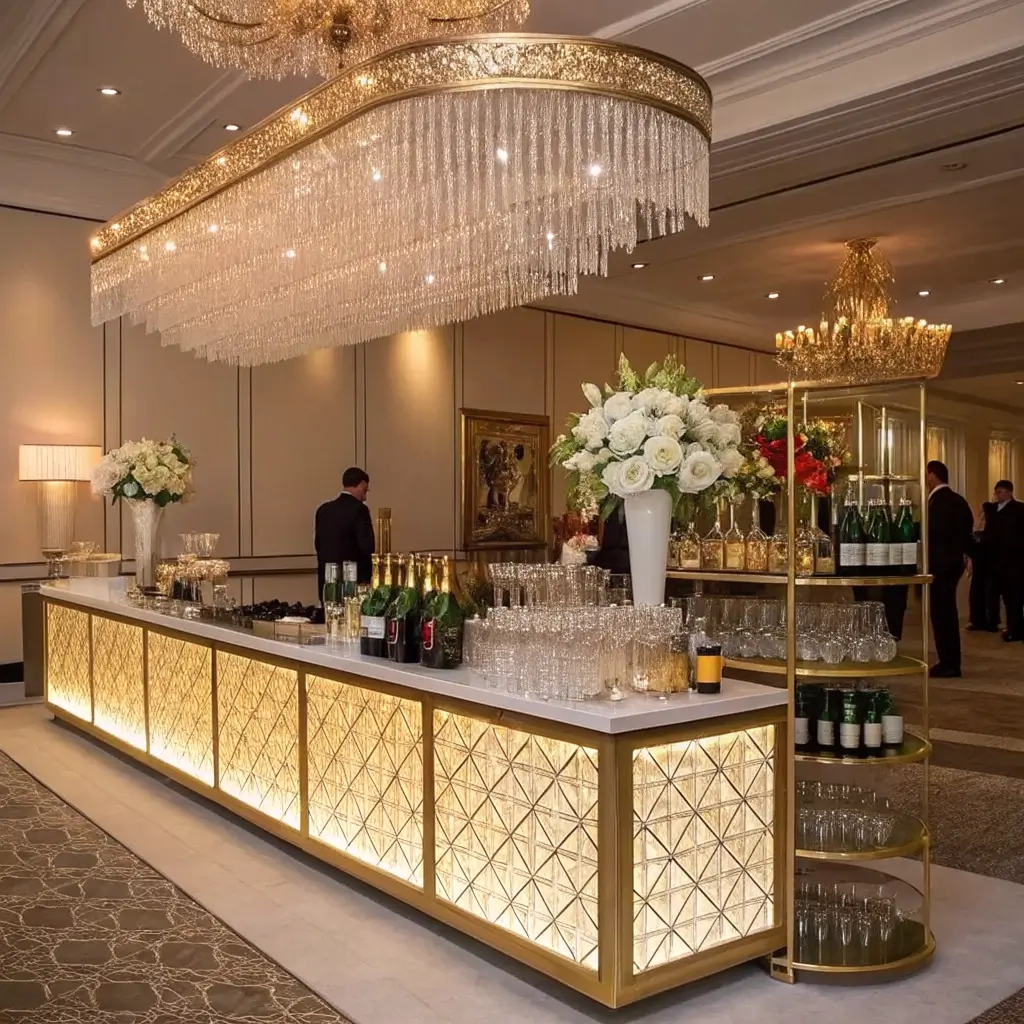 Want to channel your inner Gatsby? A gold and crystal cocktail station screams luxury and sophistication. This setup works phenomenally for evening receptions, ballroom venues, or any celebration where you want to dial up the drama.