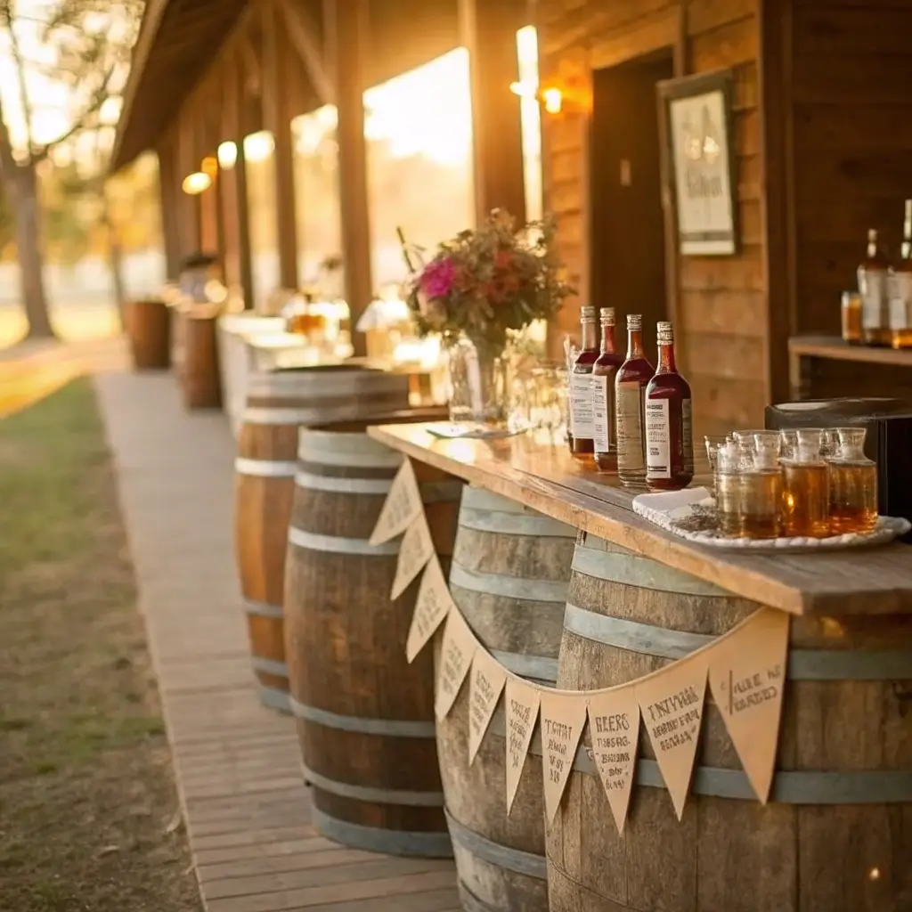 The whiskey barrel setup pairs beautifully with copper accents, leather details, and vintage glassware. You can source authentic barrels from local distilleries (some even offer personalized options), or find decorative versions that are easier to transport and set up.