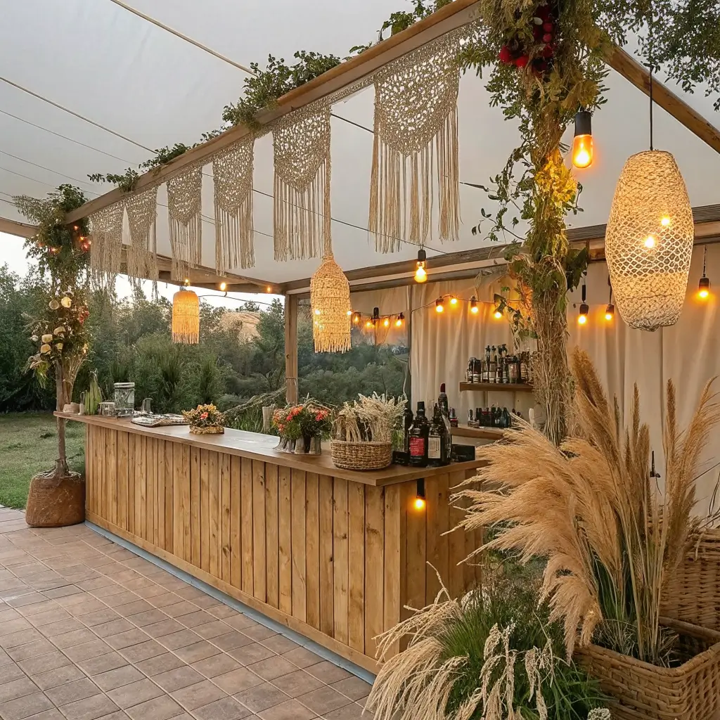 Bohemian-inspired bar setups bring texture, warmth, and artistic flair to your celebration. Think macrame wall hangings, vintage lanterns, and eclectic mix-and-match elements that create this relaxed, festival-inspired vibe.