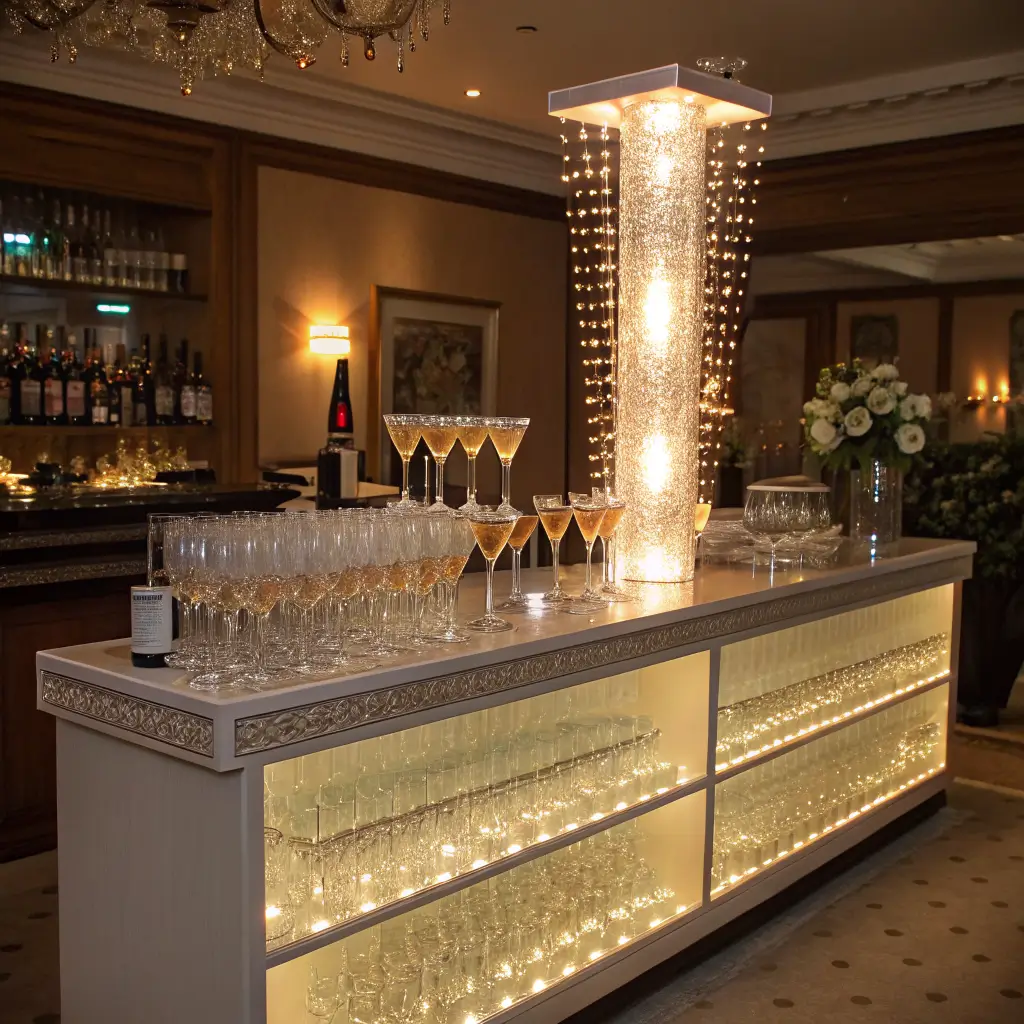 Want to create a moment that stops the party? A champagne tower with strategic LED lighting delivers pure drama and elegance. This classic setup gets a modern twist with carefully placed lighting that makes the entire display glow.