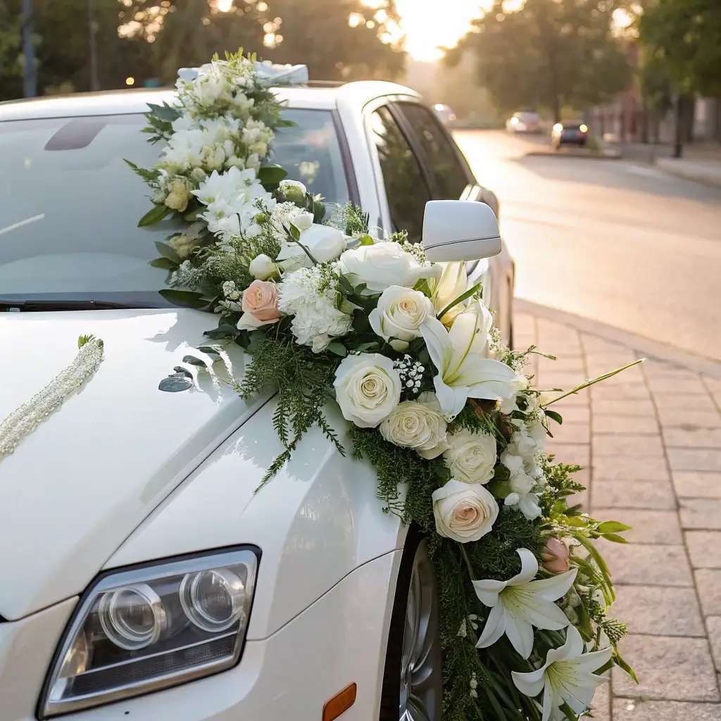 Let’s start with the classic that never goes out of style – the white floral garland. This is like the little black dress of wedding car decor; it works with literally everything and makes you look effortlessly elegant.