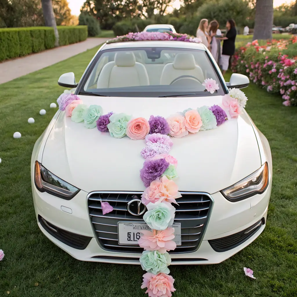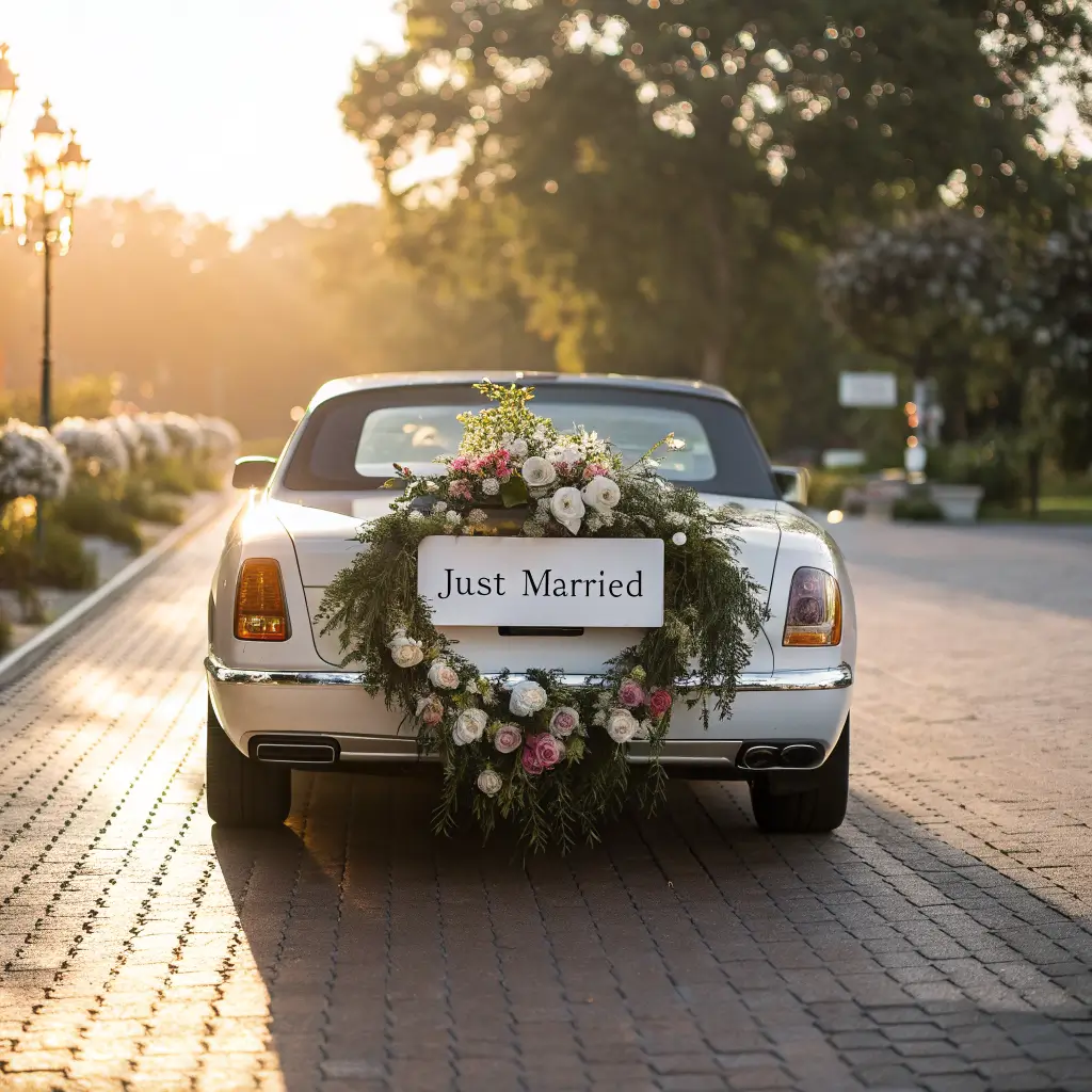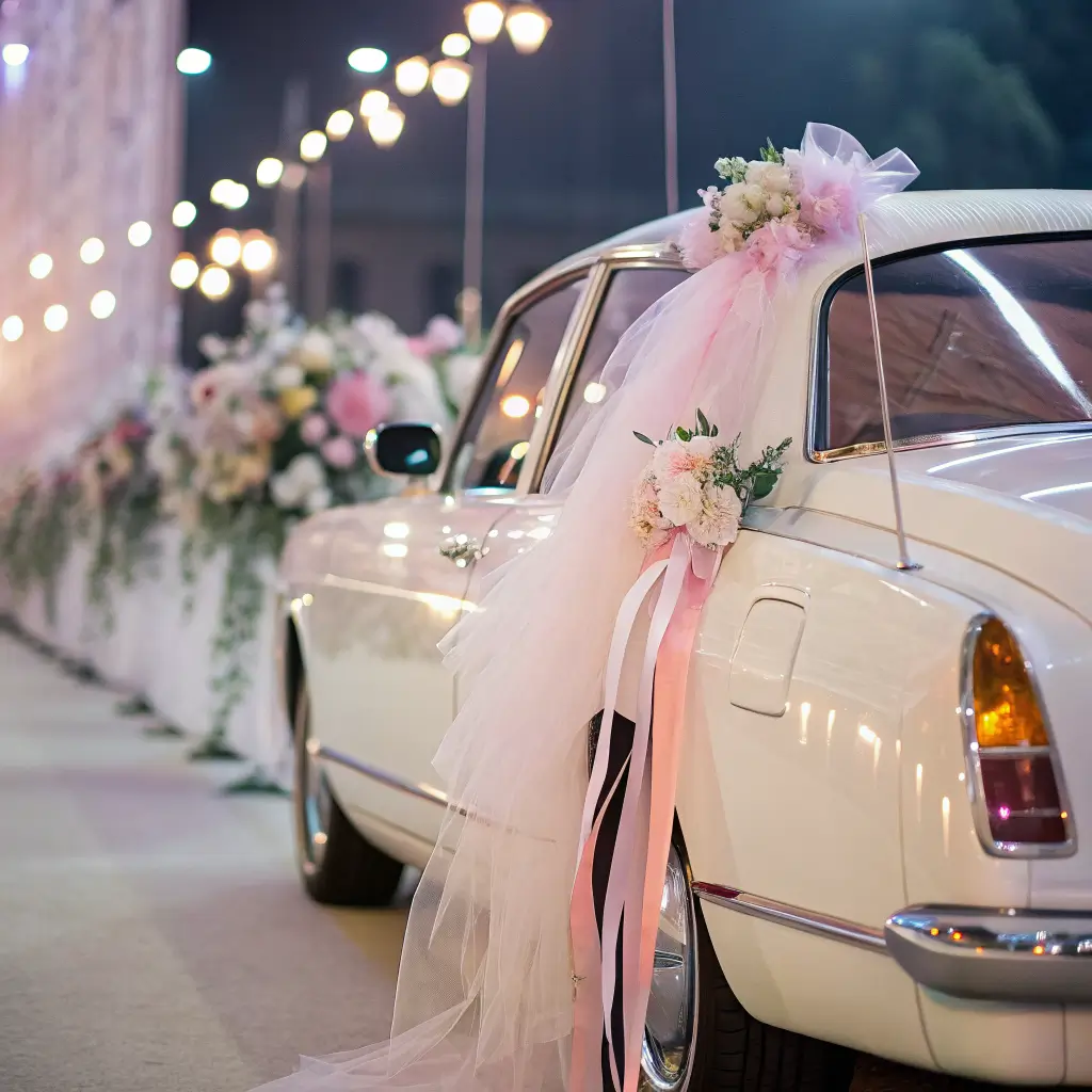 Choosing the right car decor really comes down to your personal style and wedding theme. Are you classic and elegant? Go with white florals or satin bows. Feeling whimsical and fun? Balloons or fairy lights might be your jam. Want something completely unique? DIY paper flowers could be perfect.