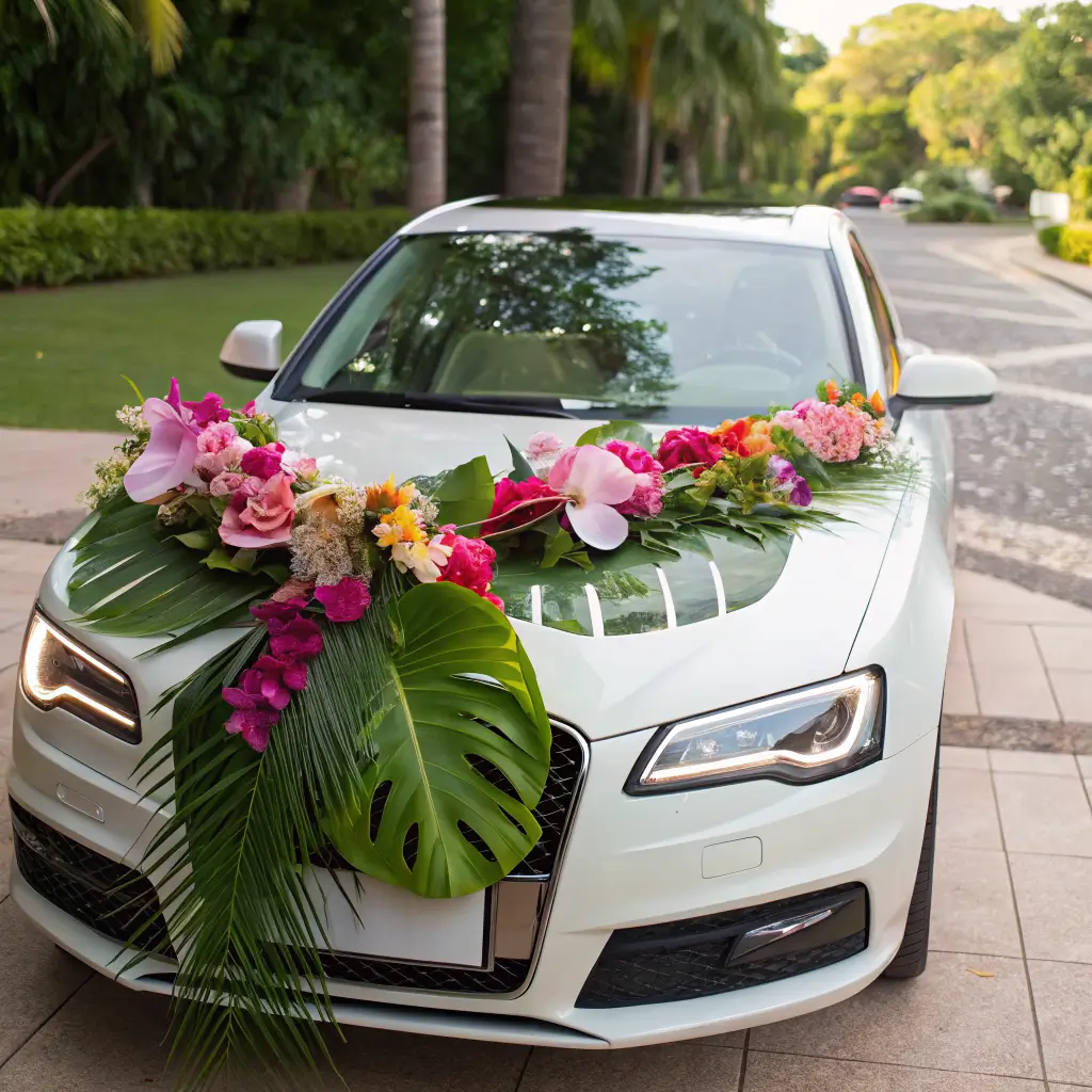 This style is bold and dramatic without being overwhelming. The key is using the natural architecture of tropical plants to create flowing, organic arrangements that complement your car’s lines.