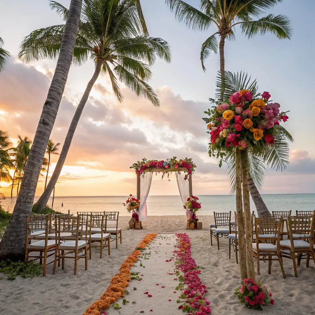 Ever notice how destination weddings always look amazing in photos? It’s not just the beach backdrop – it’s the commitment to tropical decor that sells the whole vibe. Good news: you can create this anywhere, even in landlocked Ohio.