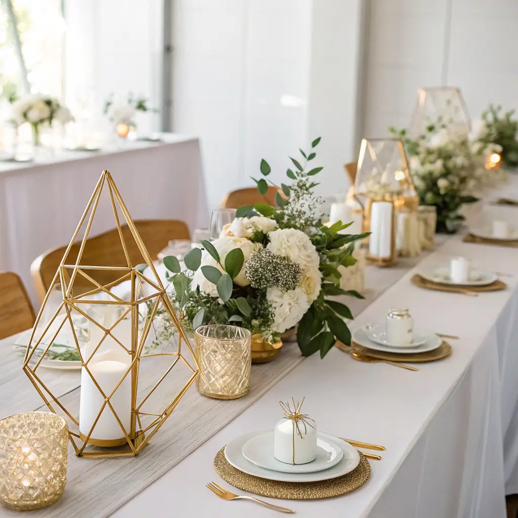 The trick with geometric decor is softening those hard edges with organic elements. Flowing fabric, soft florals, and curved glassware prevent your reception from feeling like a math classroom 🙂