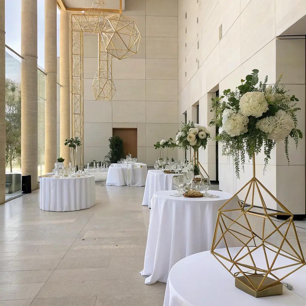 Colors typically include black, white, gold, and silver, with pops of rich jewel tones like emerald or ruby. Every element should feel luxurious and camera-ready. This style particularly works if you’re planning extensive photography – everything photographs beautifully!