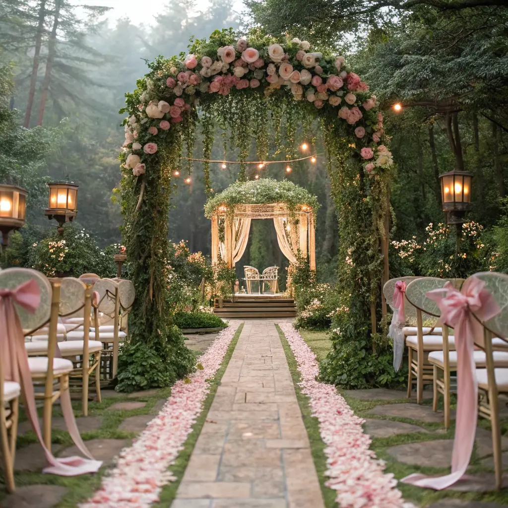 Colors typically include soft pastels – blush pink, lavender, mint green, and cream. Add metallic touches in rose gold or soft gold to enhance that magical feeling. IMO, you can never have too many flowers at a fairytale wedding 🙂