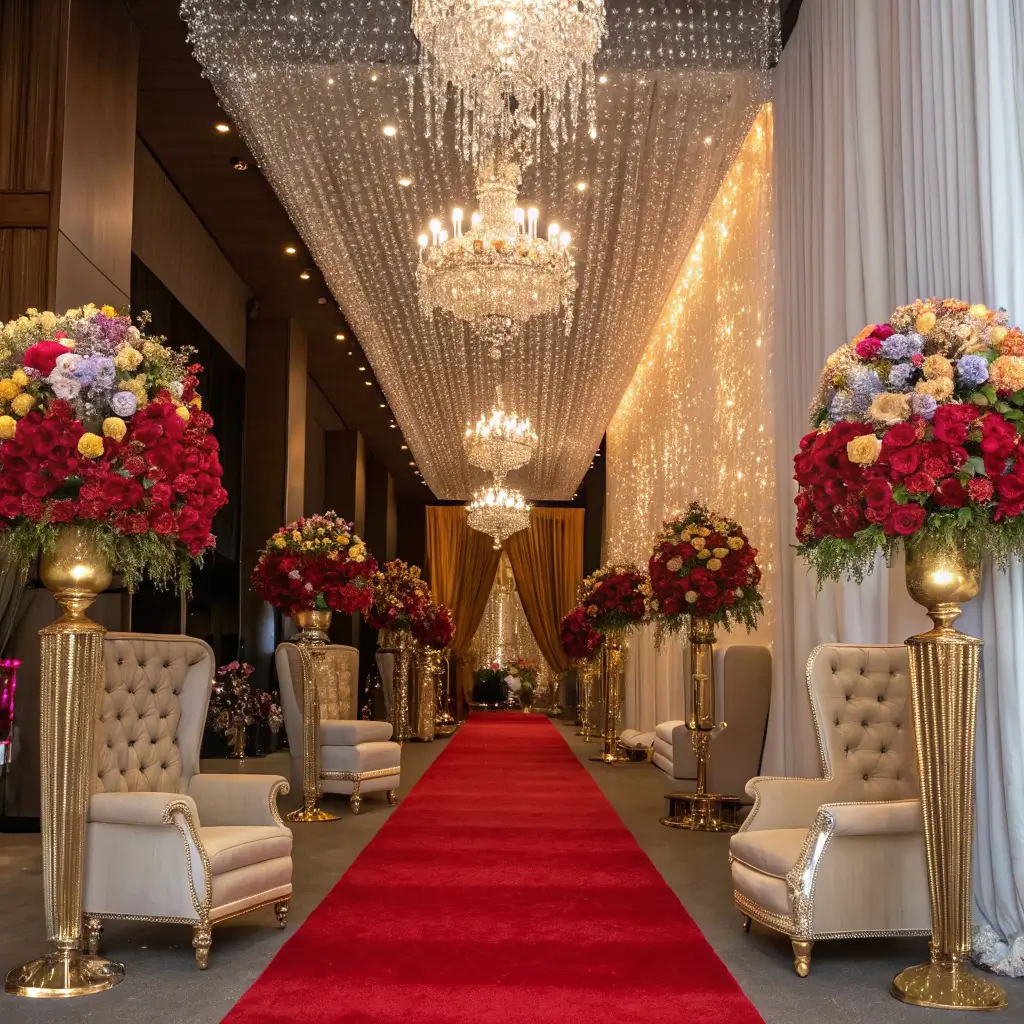 - Cascading floral installations from ceilings or arches