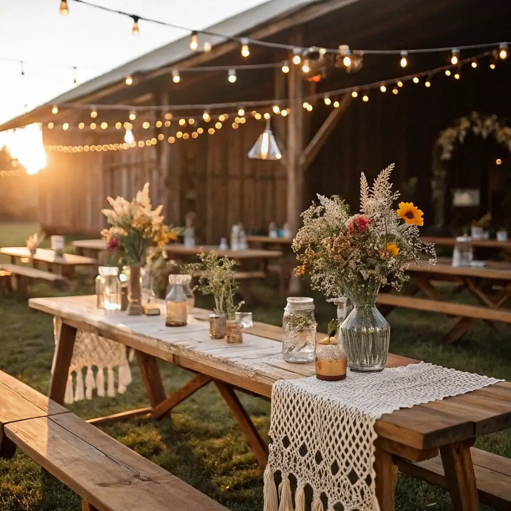 Textural elements like burlap, lace, twine, and wood should appear throughout your decor. Mix them in unexpected ways – lace wrapped around mason jars, twine tied around napkins, or wooden signs with calligraphy directions.