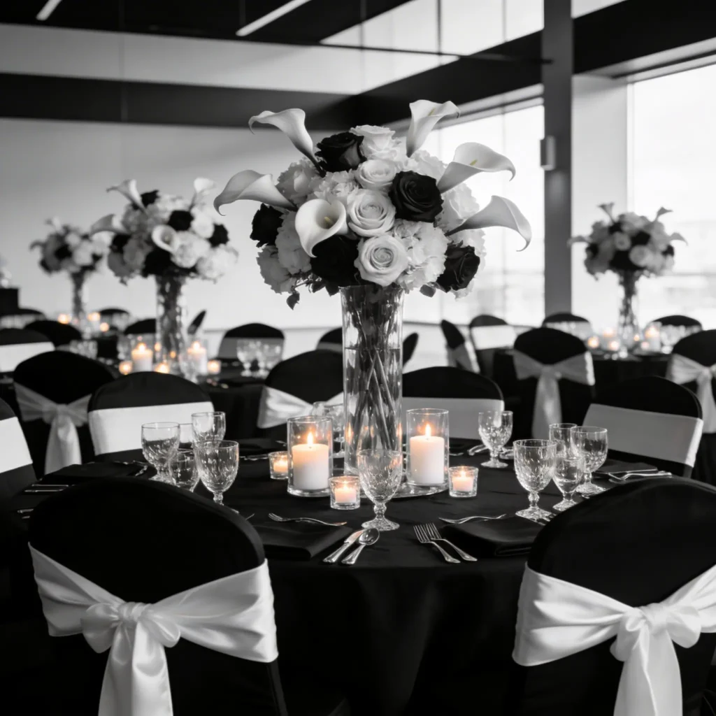 The trick is playing with textures and patterns rather than relying solely on color contrast. White linens with black napkins are just the starting point. Add crystal glassware, silver charger plates, and white roses with dark greenery for depth.