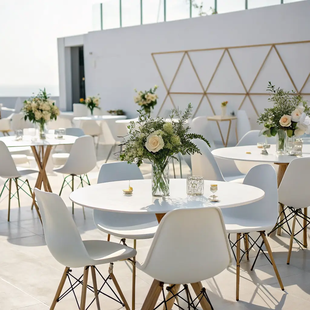 Clean lines and geometric shapes are your foundation here. Think acrylic chairs, marble table runners, and single-stem centerpieces. The color palette should be neutral – whites, creams, soft grays, and maybe one accent color if you’re feeling bold.