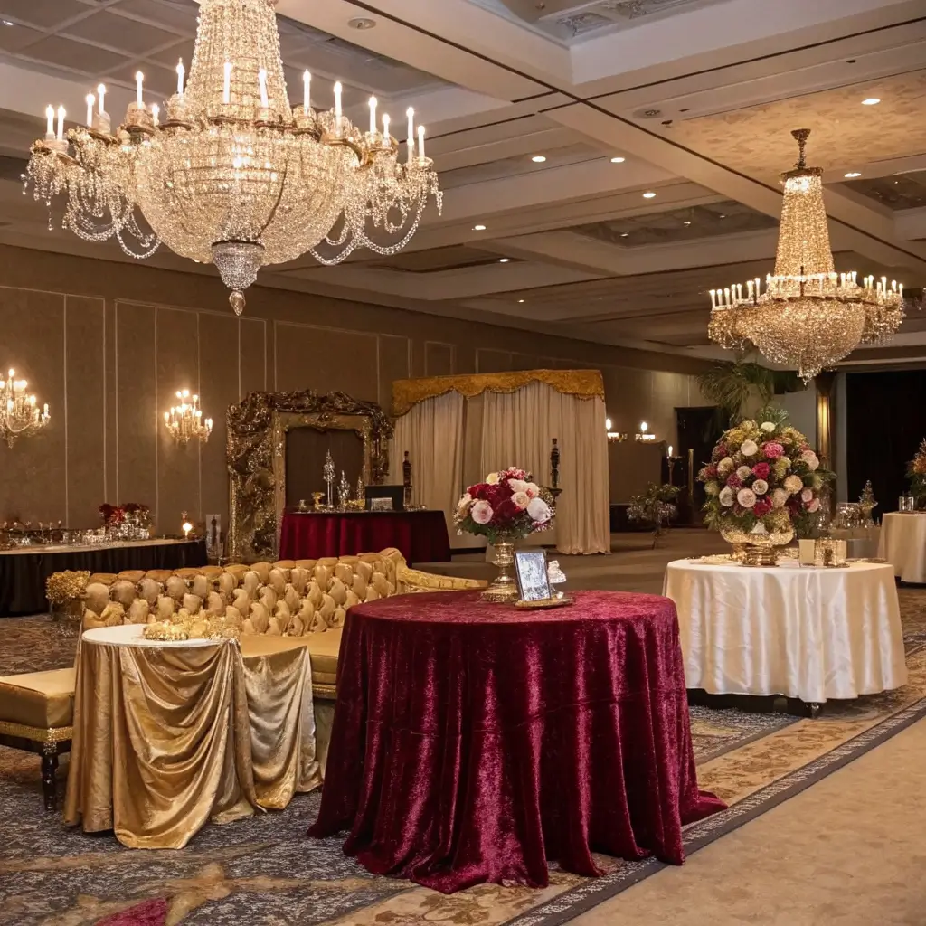 Metallic accents are non-negotiable here. Gold, rose gold, and silver should appear throughout your decor. Sequined table runners, crystal chandeliers, and vintage mirrors create that glamorous atmosphere you’re after.