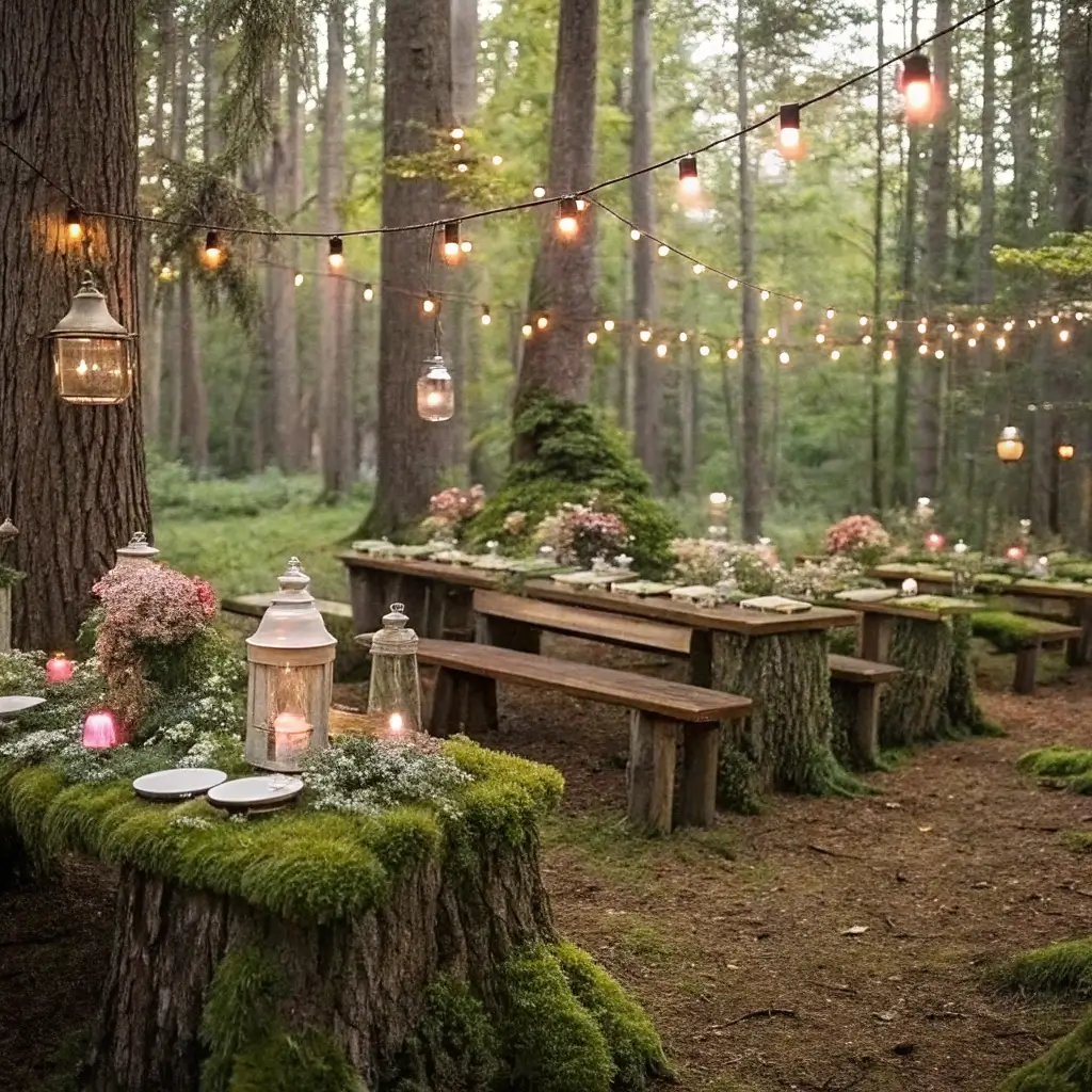 Lighting is crucial for woodland themes. Lanterns, string lights, and candles create that magical glow that makes everything feel enchanted. Paper lanterns in tree branches or fairy lights wrapped around trunks add to the whimsical atmosphere.
