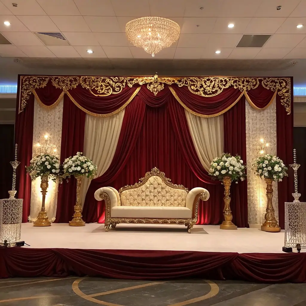 Let’s kick things off with something that screams luxury without actually breaking the bank. A royal velvet backdrop stage gives you that instant regal vibe that makes everyone feel like they’re at a palace wedding. And who doesn’t want to feel like royalty on their wedding day?