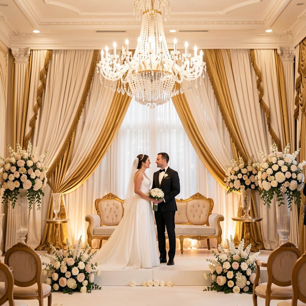 After all that Bollywood drama, let’s swing to the opposite end. Minimalist white draping proves that sometimes less really is more. This style works especially well if you’ve got a stunning venue you don’t want to hide.