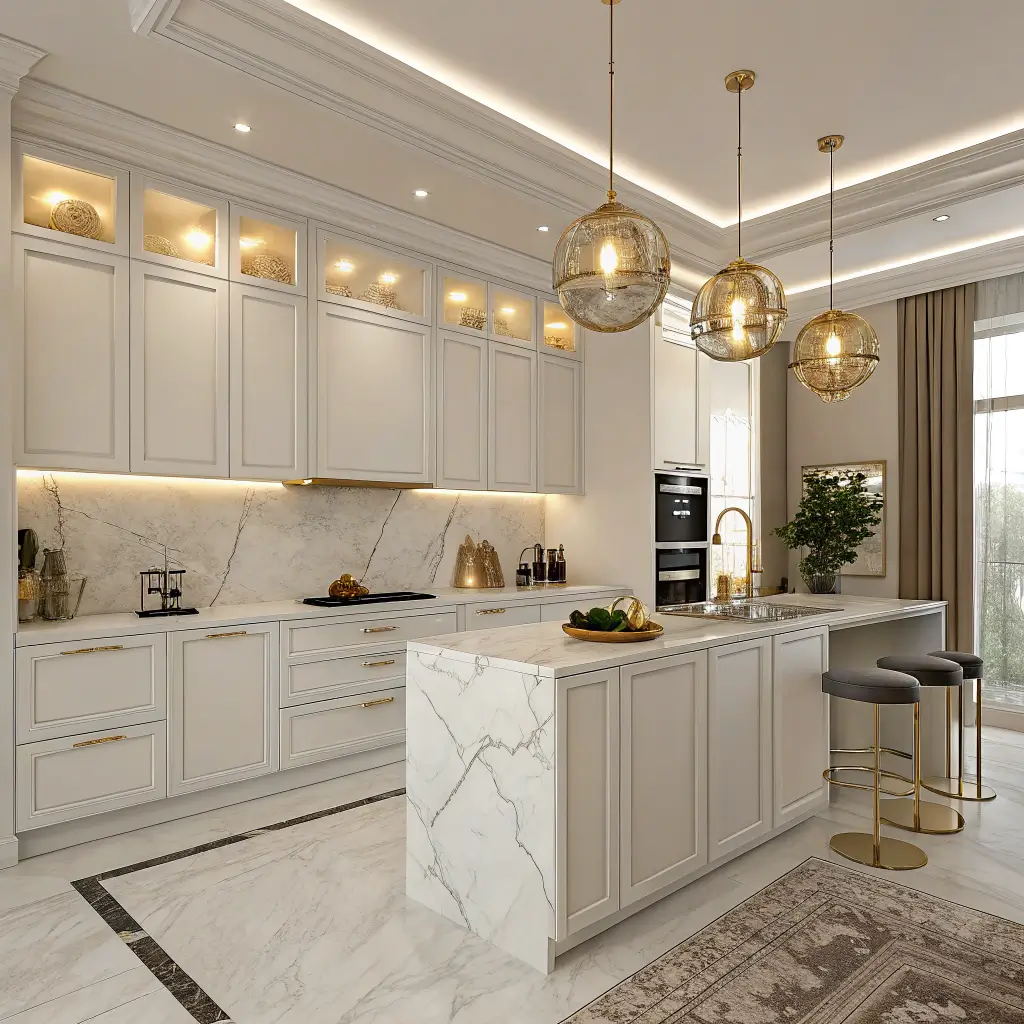 Luxurious White and Gold Kitchen Cabinets