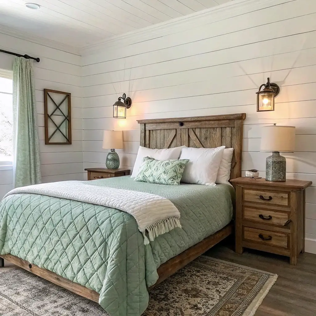 Start with white shiplap or board-and-batten walls – they add instant character without overwhelming the space. Layer in sage green through vintage-inspired quilts, painted furniture pieces, or botanical prints in weathered frames. The goal? Creating that “I just inherited my grandmother’s charming cottage” vibe without actually having to deal with century-old plumbing.