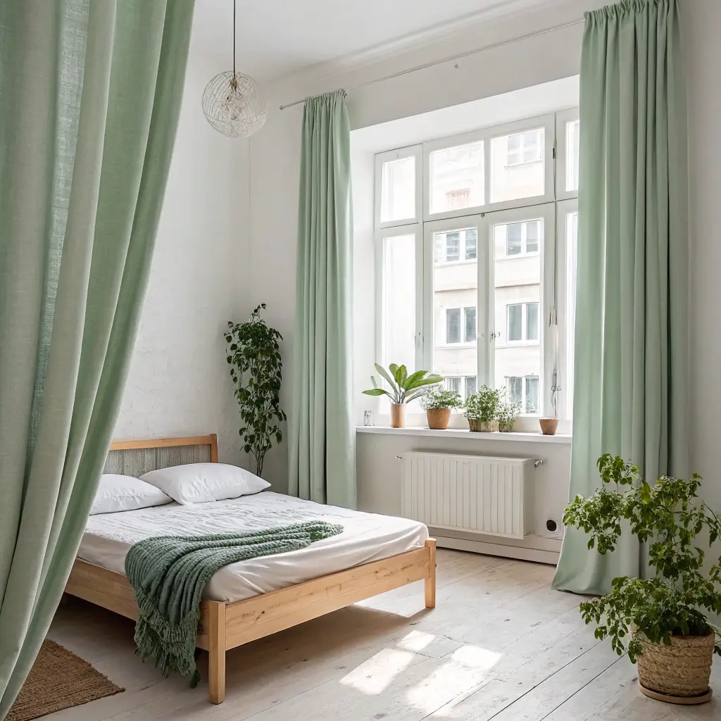 8. Soft Sage Curtains with White Minimalist Decor